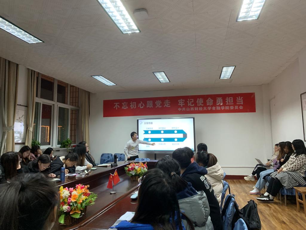 2021-2022学年第5期学术沙龙活动在杨馨同学的主持下如期举行,本次沙龙的主题是"数字金融如何影响实体企业金融投资", 由2021级金融专硕班的赵雅萱和张琦为大家作汇报讲解,本次沙龙有幸邀请到李小娟老师和王琳老师作为讲评嘉宾,参加这次学术沙龙的是2021级各专业学生。