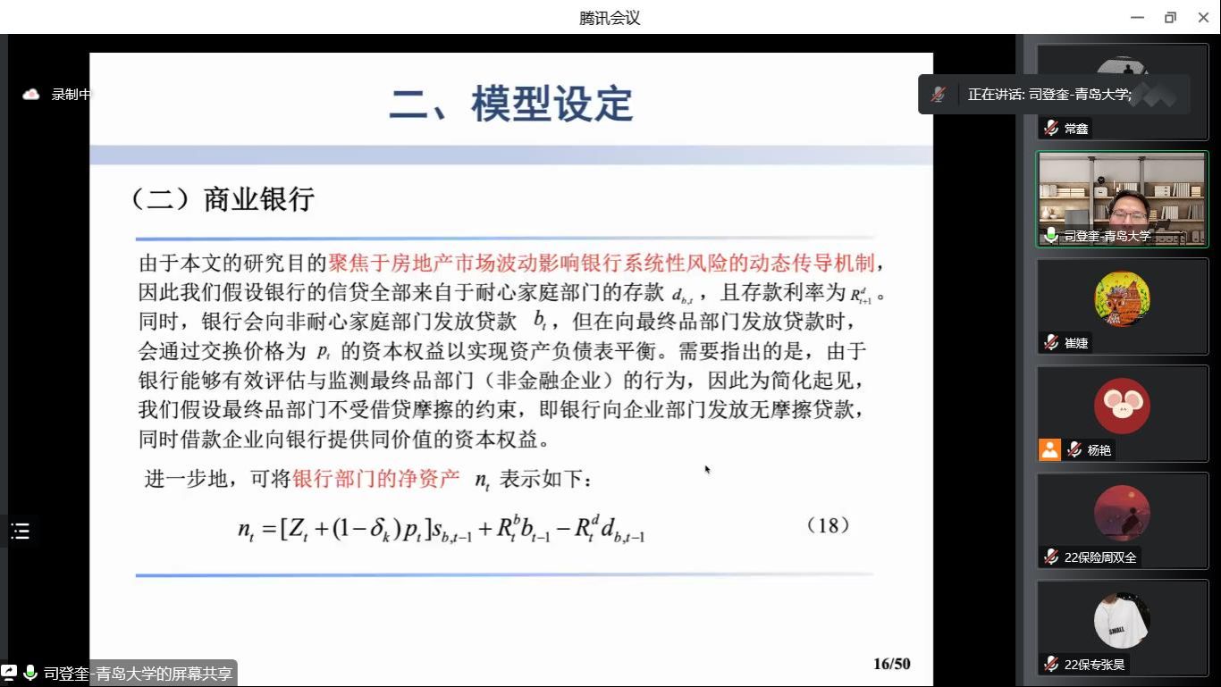崔婕教授主持,学院邀请青岛大学经济学院教授司登奎教授讲解了题为“金融稳定目标下非常规财政政策与宏观审慎政策的协同效应研究”的精彩学术报告,参会人员包括魔镜号