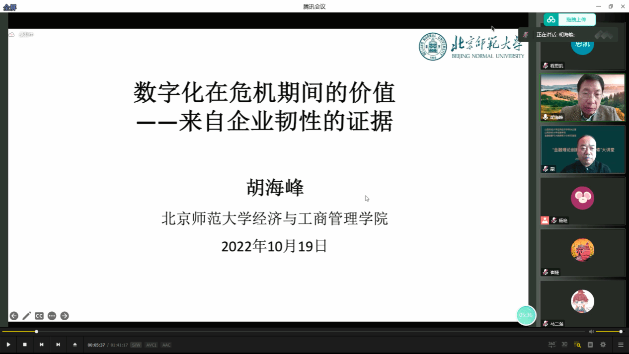 本次会议由山西财经大学副校长沈沛龙教授主持,邀请到了北京师范大学经济与工商管理学院金融系主任胡海峰教授讲解了一篇题为“数字化在危机期间的价值——来自企业韧性的证据”的精彩的学术报告,参会人员包括魔镜号